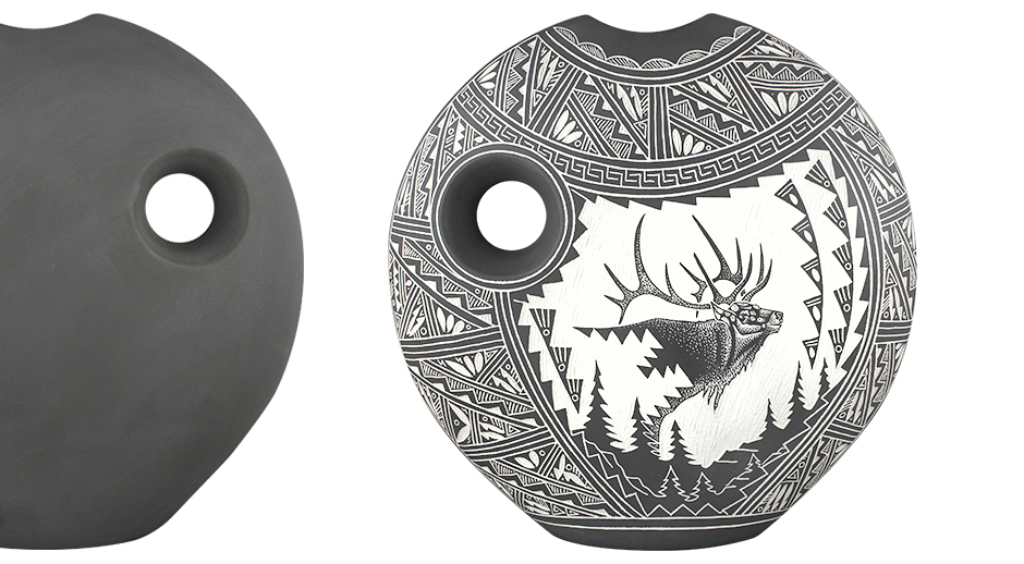 Das trockene Rohgefäß wird mit einem „Slip“ versehen. (Überzug aus feinstem aufgeschäumten Ton in der gewünschten Färbung). Dieser Tonfilm wird in mühevoller Arbeit mit einem glatten Kieselstein oder Pipestone (Calinit) solange abgerieben bis die Oberfläche absolut glatt und glänzend wird.
